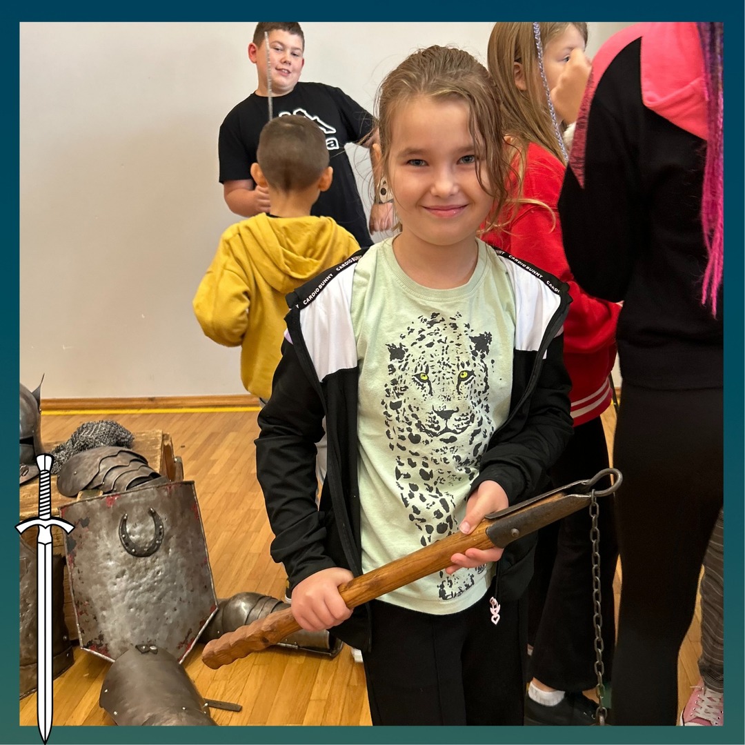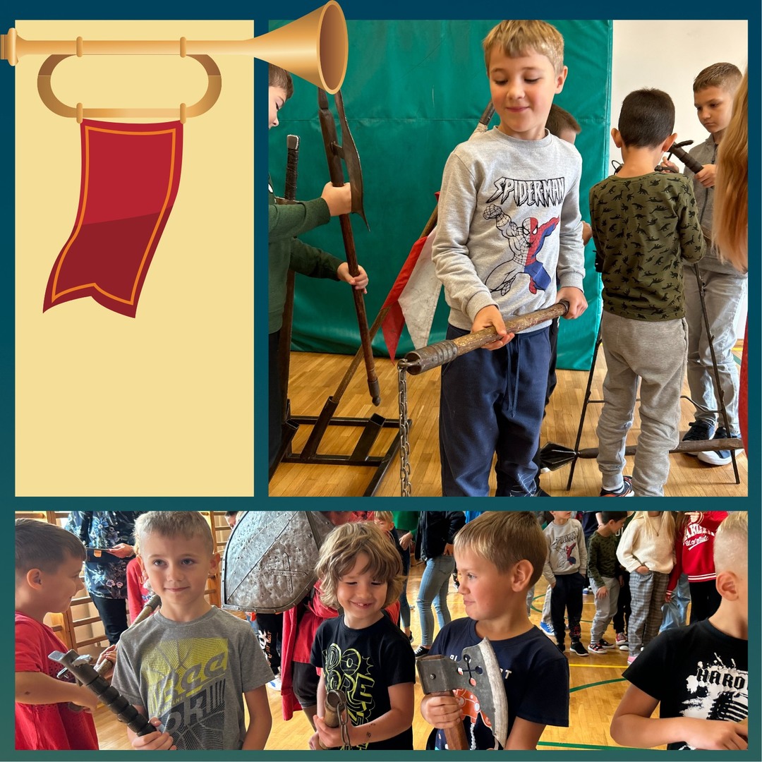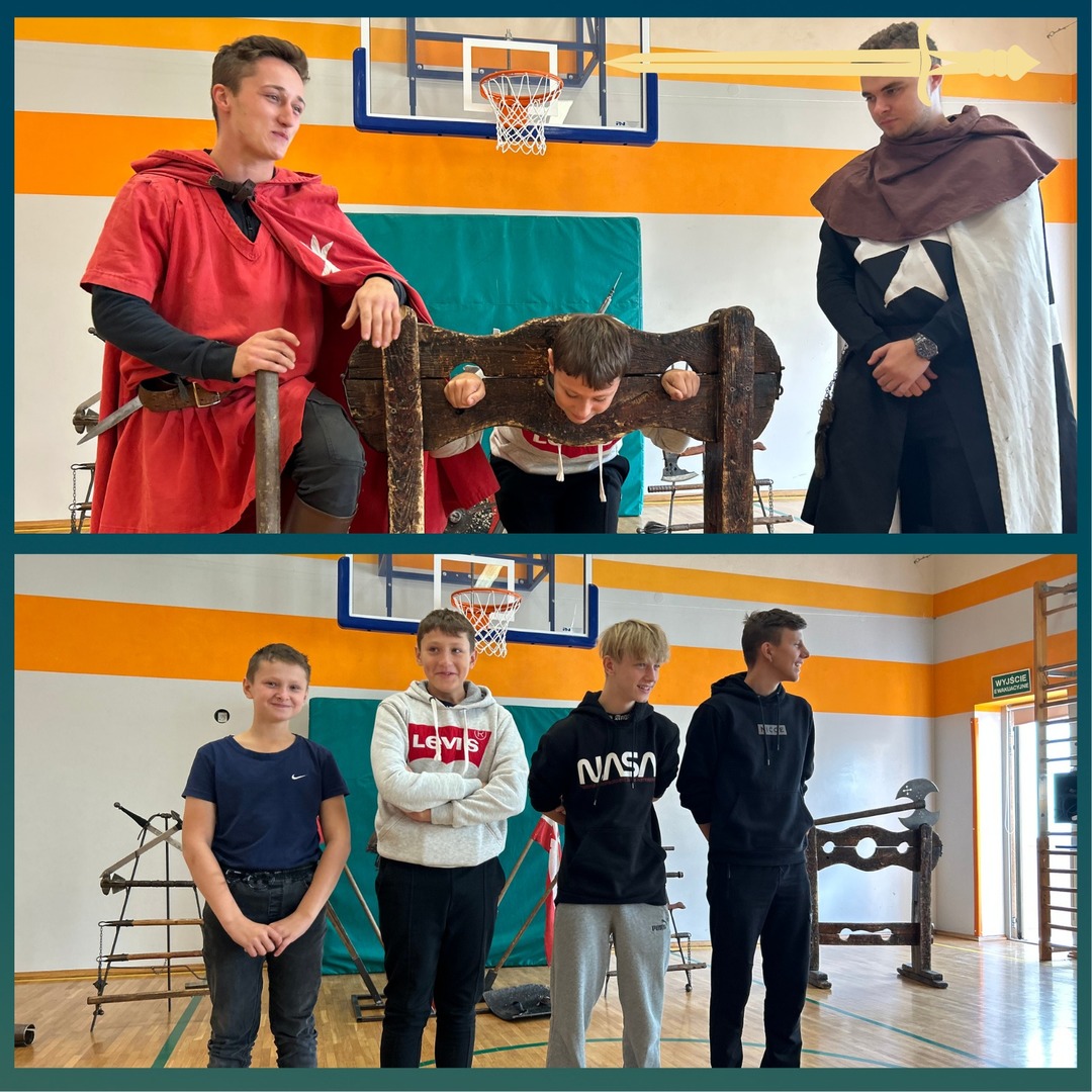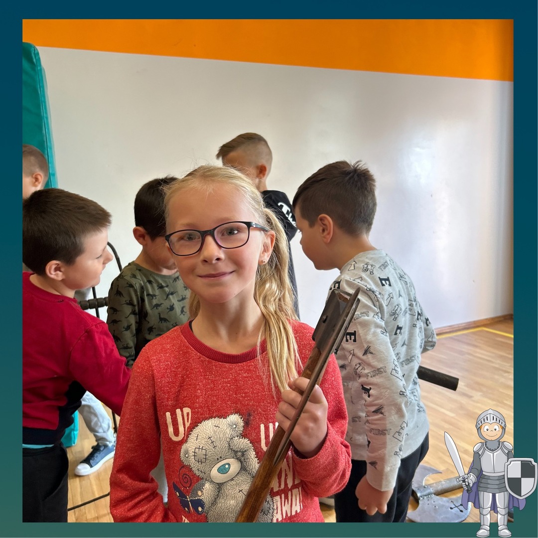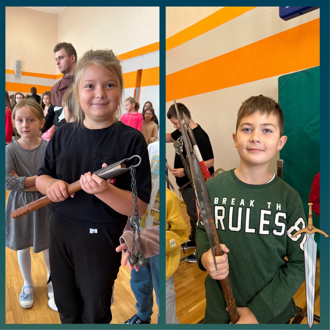 Grupa rekonstrukcyjna prezentowała obyczaje i kulturę epoki średniowiecza. Wiele dowiedzieliśmy się o uzbrojeniu rycerza, sposobach walki, broni, którą się wtedy posługiwano. Wśród uczniów znaleźli się chętni, aby przymierzyć elementy zbroi i wypróbować broń rycerską.![]()