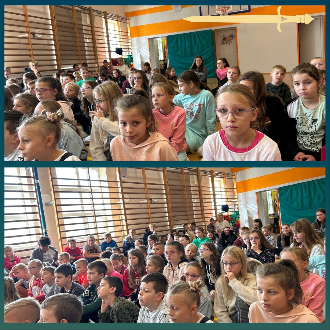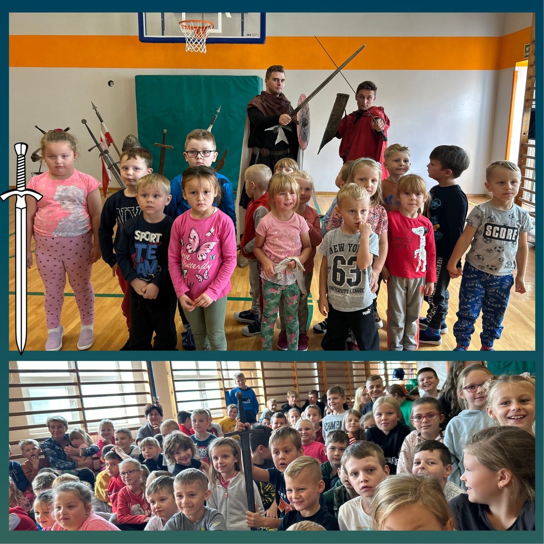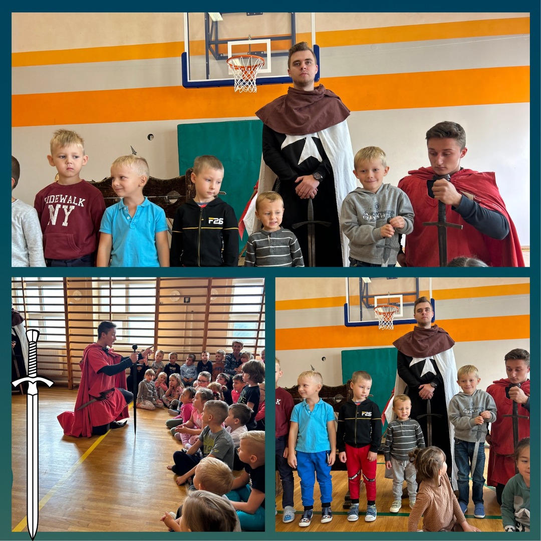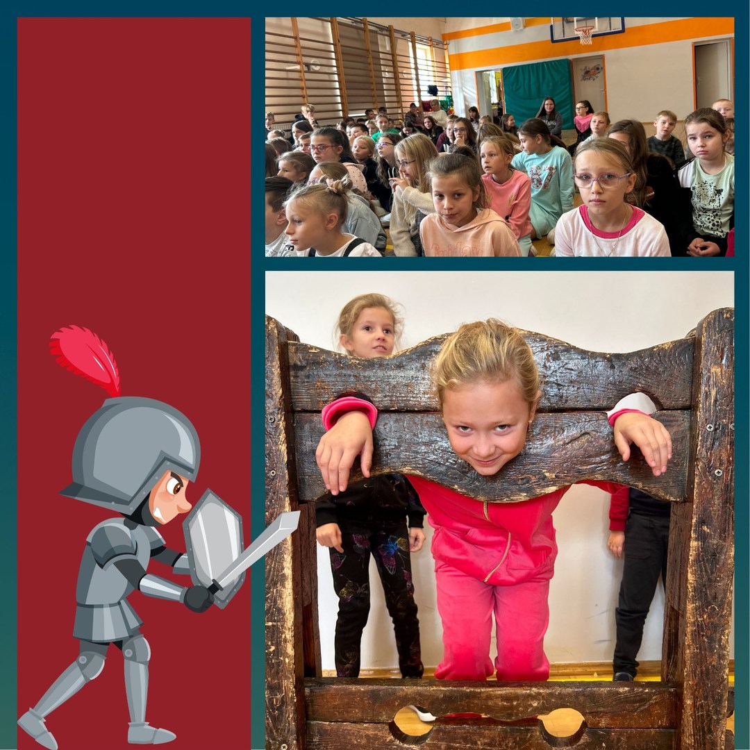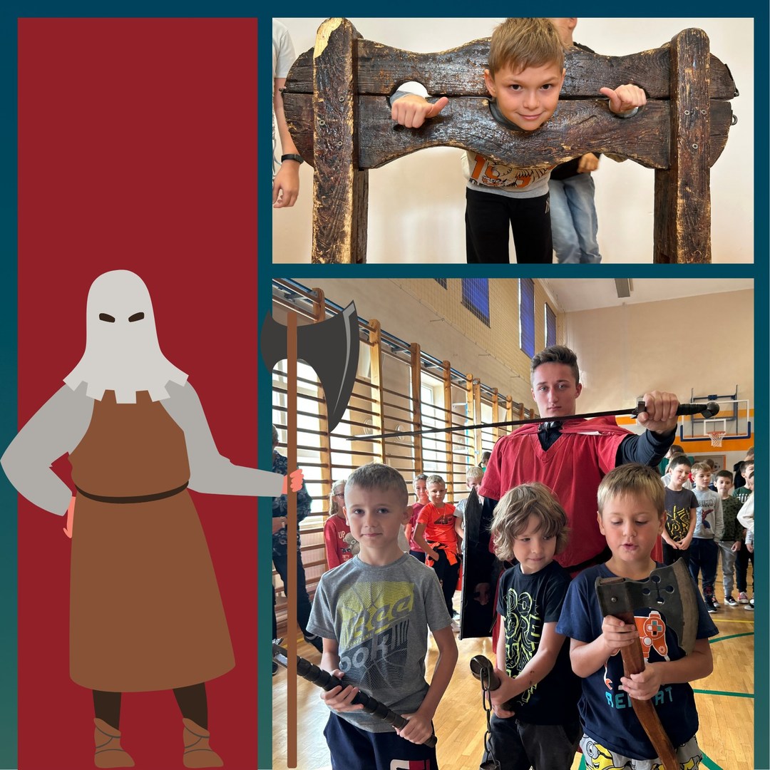 Grupa rekonstrukcyjna prezentowała obyczaje i kulturę epoki średniowiecza. Wiele dowiedzieliśmy się o uzbrojeniu rycerza, sposobach walki, broni, którą się wtedy posługiwano. Wśród uczniów znaleźli się chętni, aby przymierzyć elementy zbroi i wypróbować broń rycerską.![]()