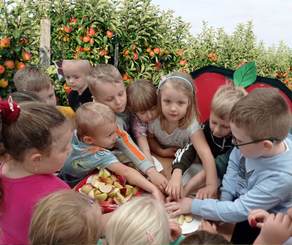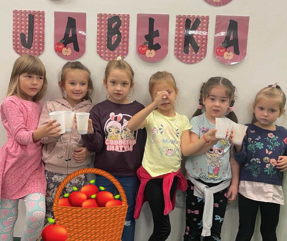 Przedszkolaki z ogromnym zaangażowaniem poszerzały swoją wiedzę o jabłku: poznawały różne gatunki jabłek, smaki, kolory i kształty. Układały puzzle i wykonały piękne prace plastyczne. Z pomocą pań zrobiły pyszny sok, który wypiły z apetytem.