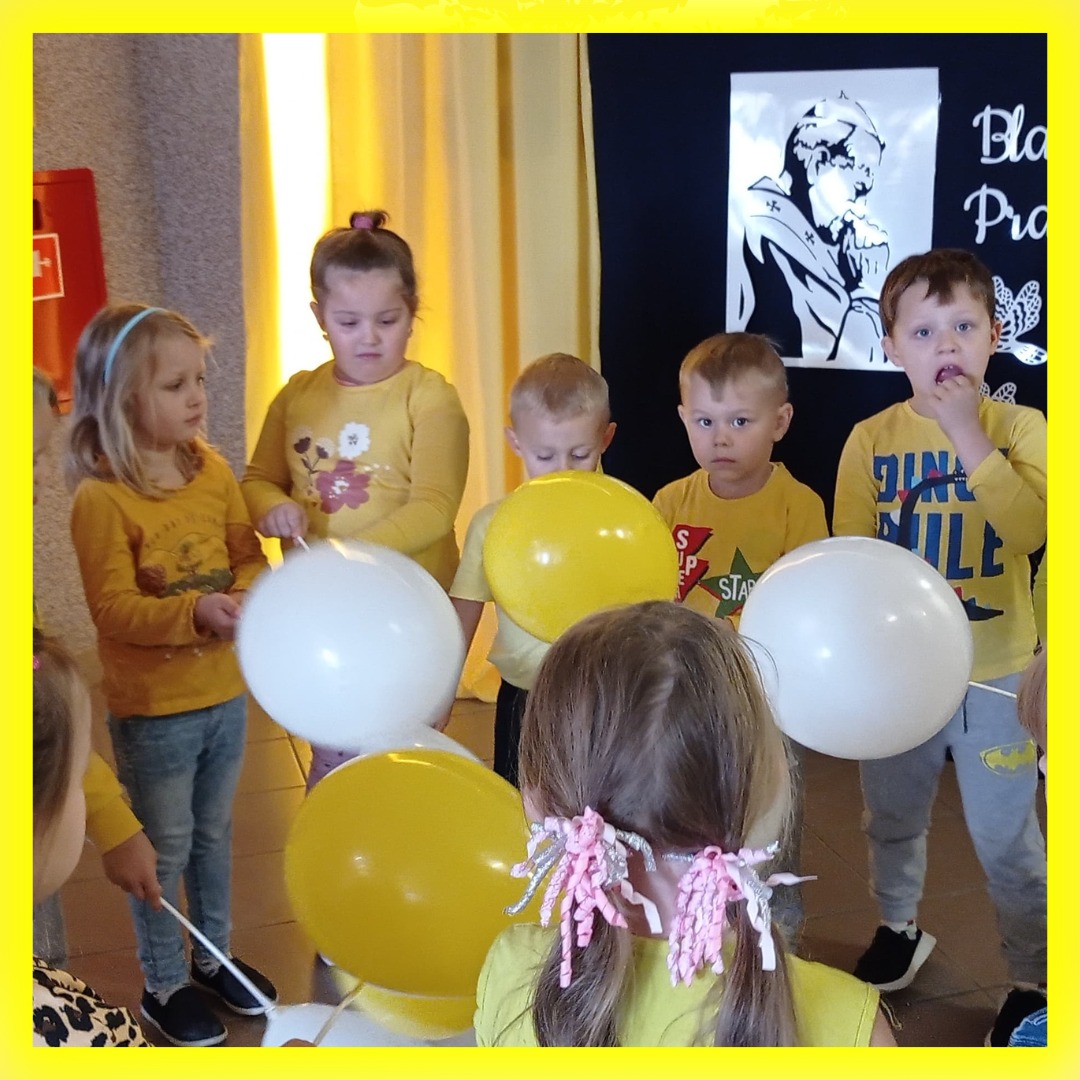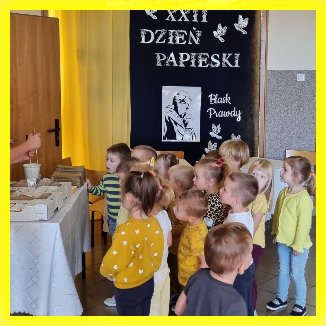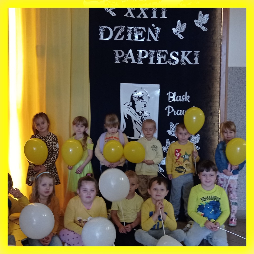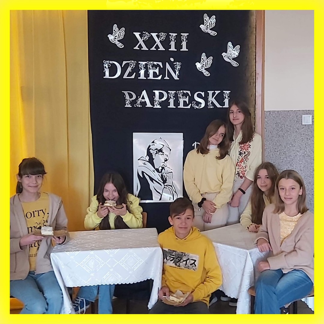 Żółty to kolor piękna i bogactwa, natomiast biały jest barwą symbolizującą czystość. Szkolna dekoracja nawiązywała do tematu Dnia Papieskiego, a na korytarzach pojawiły się cytaty i anegdoty o Papieżu.