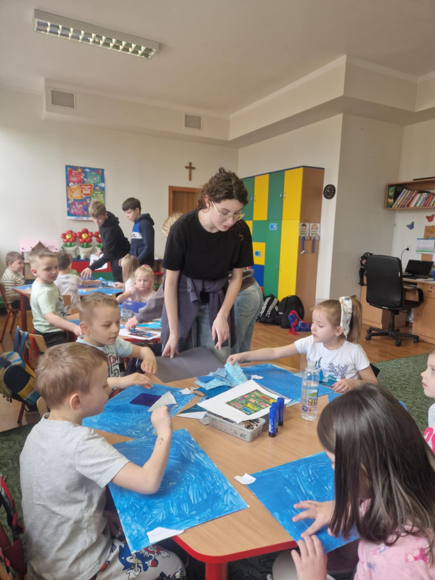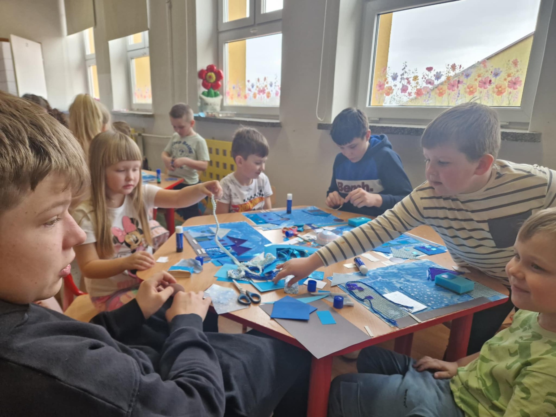 Dnia 18.03.2025 r. przedstawiciele klasy VIII: Julia Płońska, Alicja Płońska, Kacper Łupiński i Szymon Łapiński przeprowadzili warsztaty plastyczne w klasach I-III i oddziałach przedszkolnych, mające na celu przygotowanie dzieci do konkursu „Niebieskie Miasteczko”.