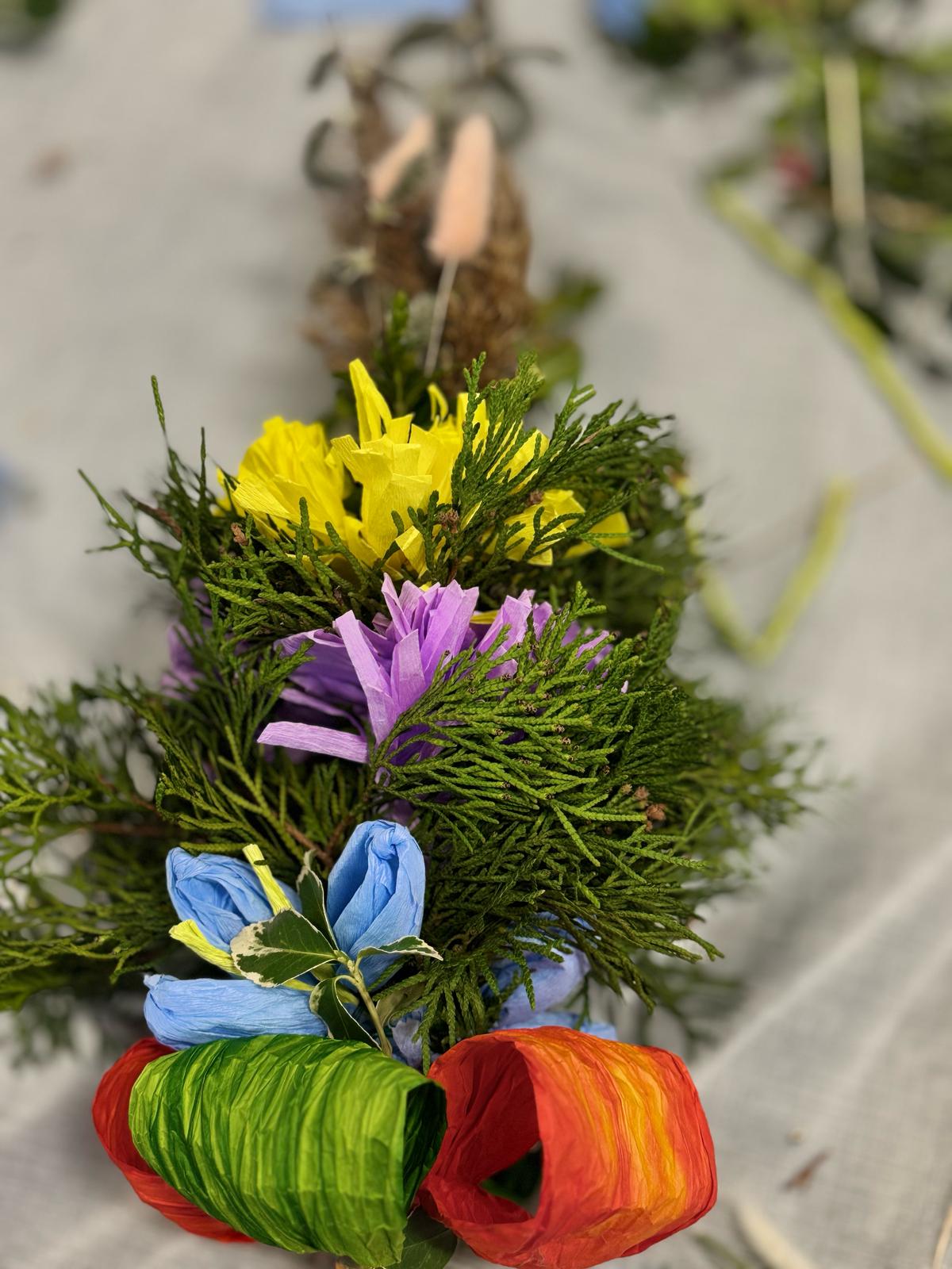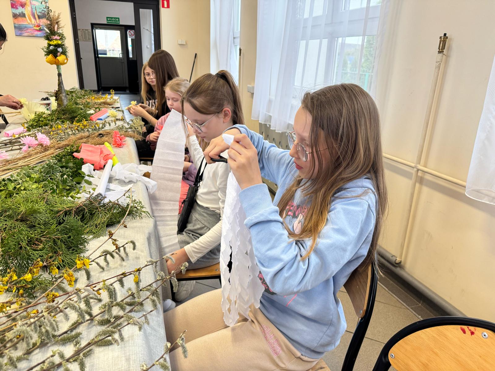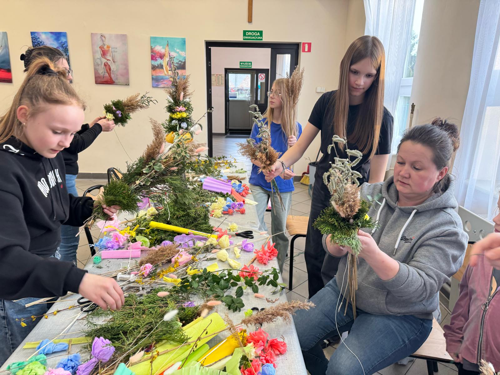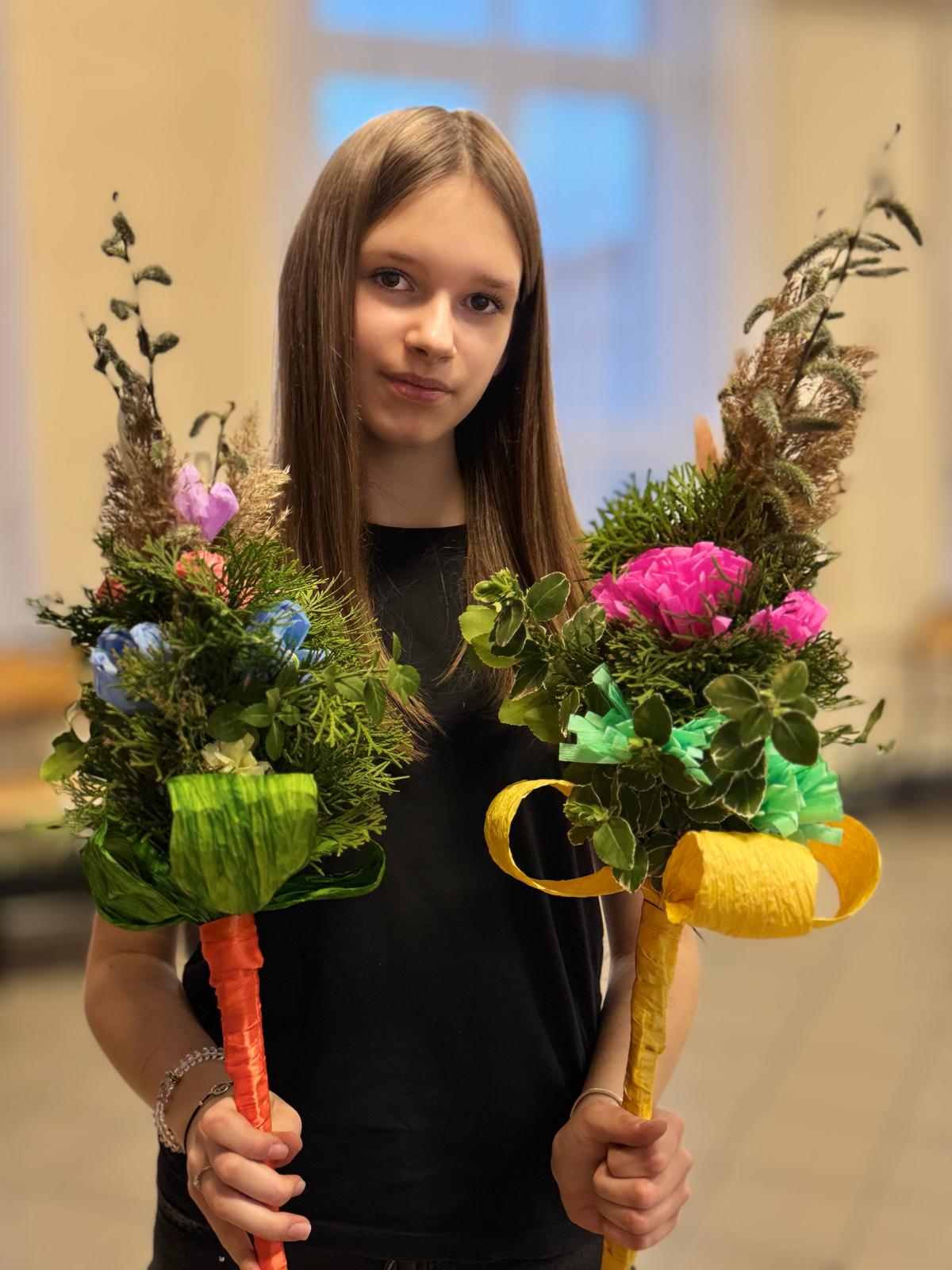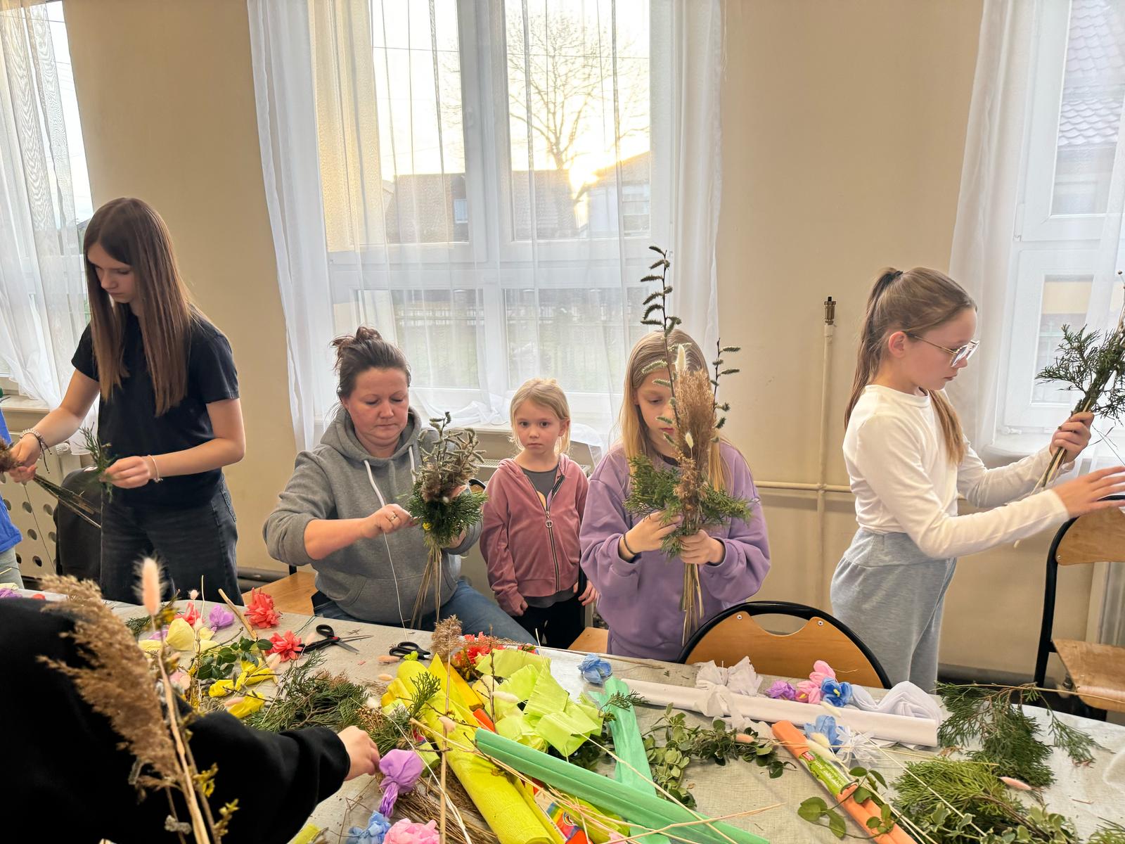 Pod czujnym okiem pani Beaty, która z pasją wprowadzała nas w tajniki tej pięknej tradycji, stworzyliśmy palmy zgodne z wielkanocnym zwyczajem. Wykorzystaliśmy naturalne materiały: bukszpan, suche trawy, puszystą trzcinę, bazie, gałązki tui, a także kolorowe wstążki i własnoręcznie wykonane kwiaty z krepiny i bibuły.