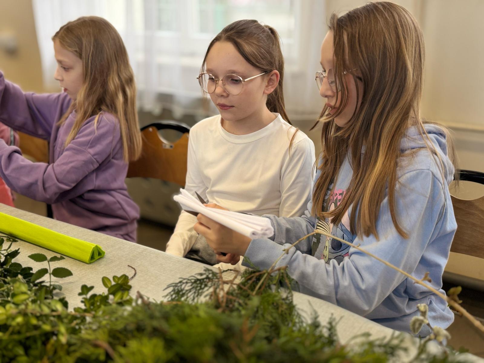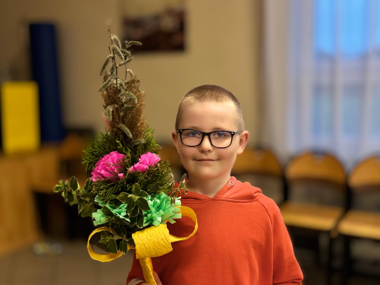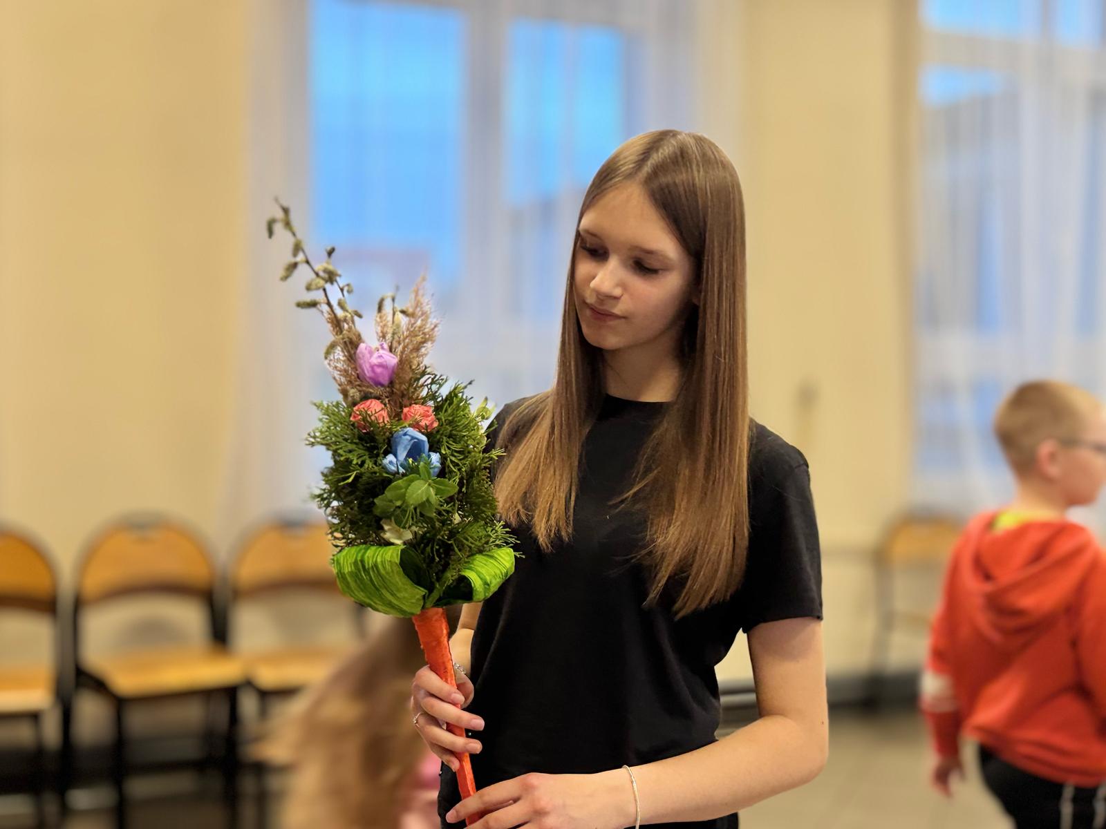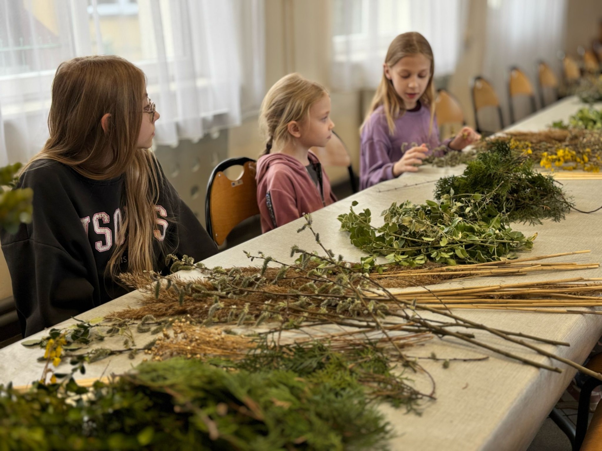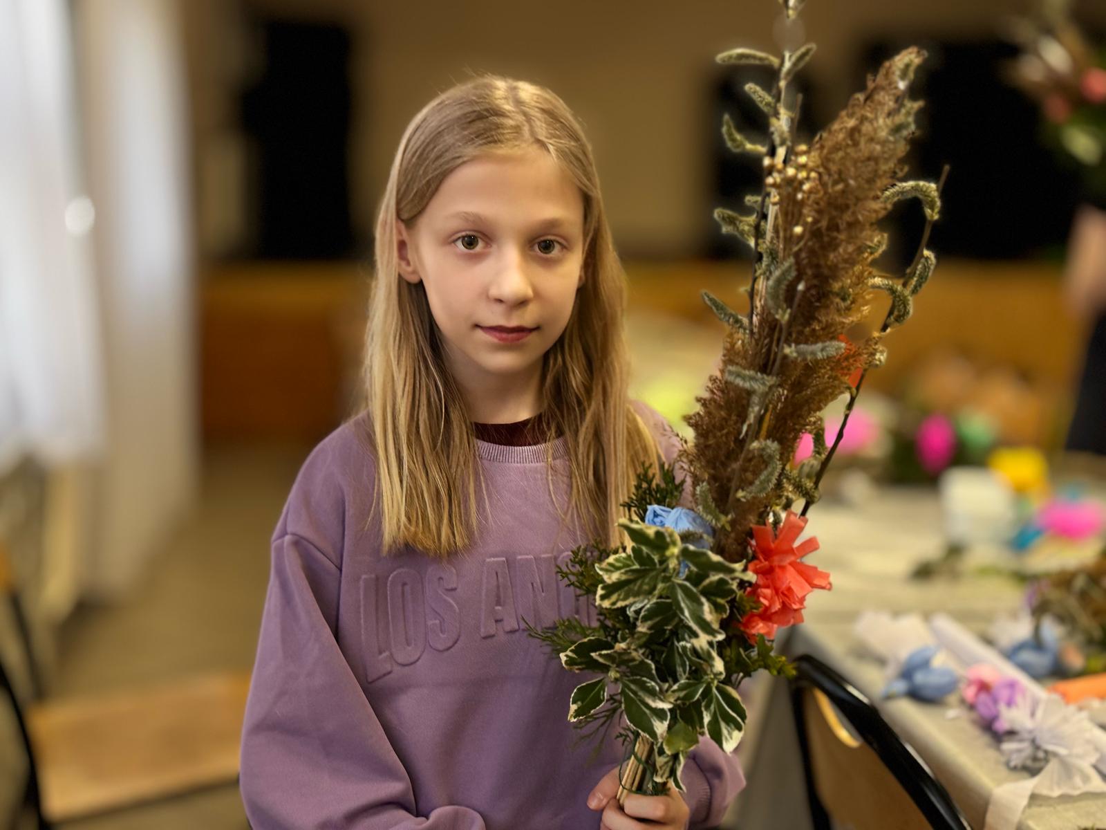 Pod czujnym okiem pani Beaty, która z pasją wprowadzała nas w tajniki tej pięknej tradycji, stworzyliśmy palmy zgodne z wielkanocnym zwyczajem. Wykorzystaliśmy naturalne materiały: bukszpan, suche trawy, puszystą trzcinę, bazie, gałązki tui, a także kolorowe wstążki i własnoręcznie wykonane kwiaty z krepiny i bibuły.