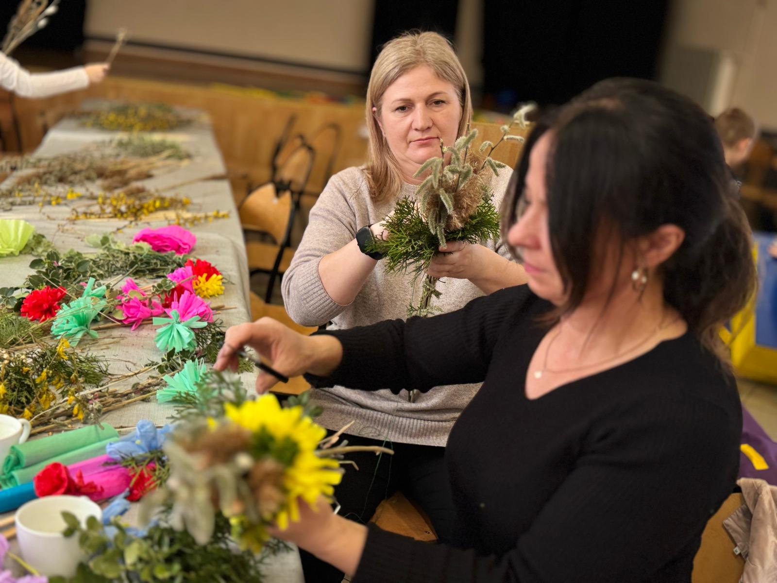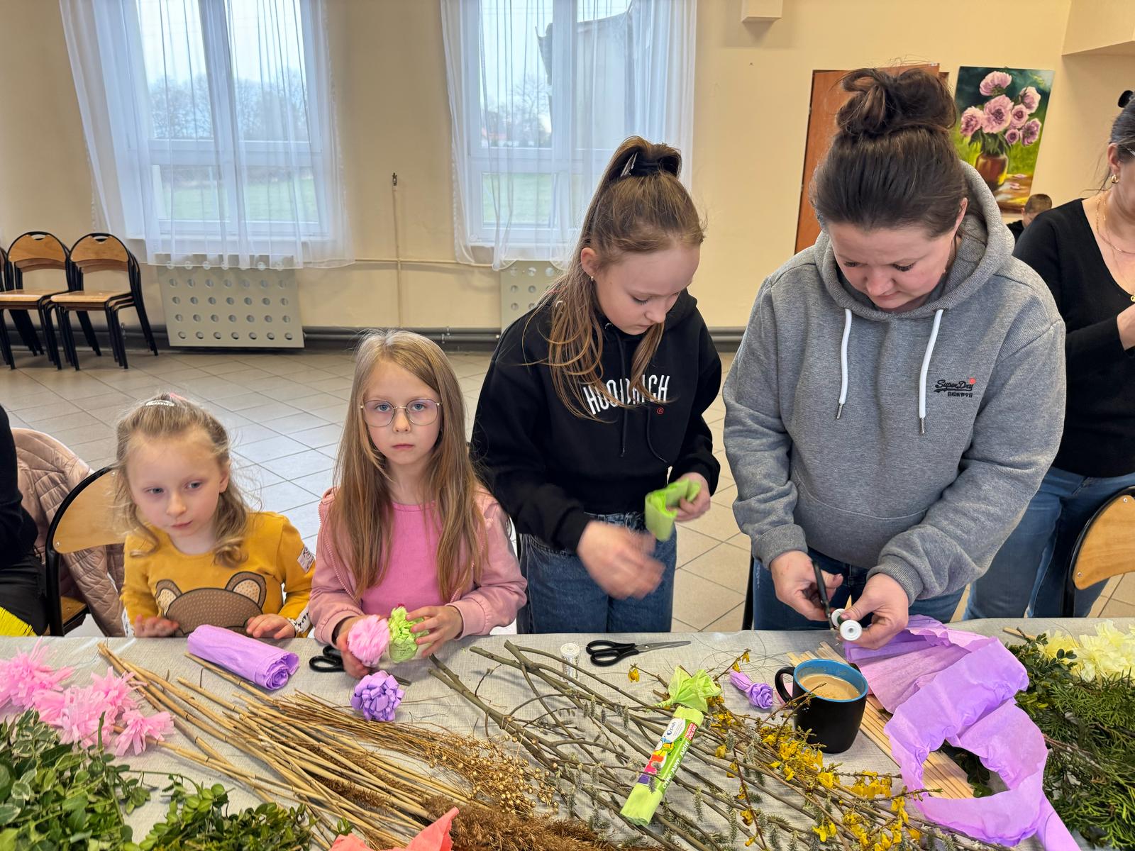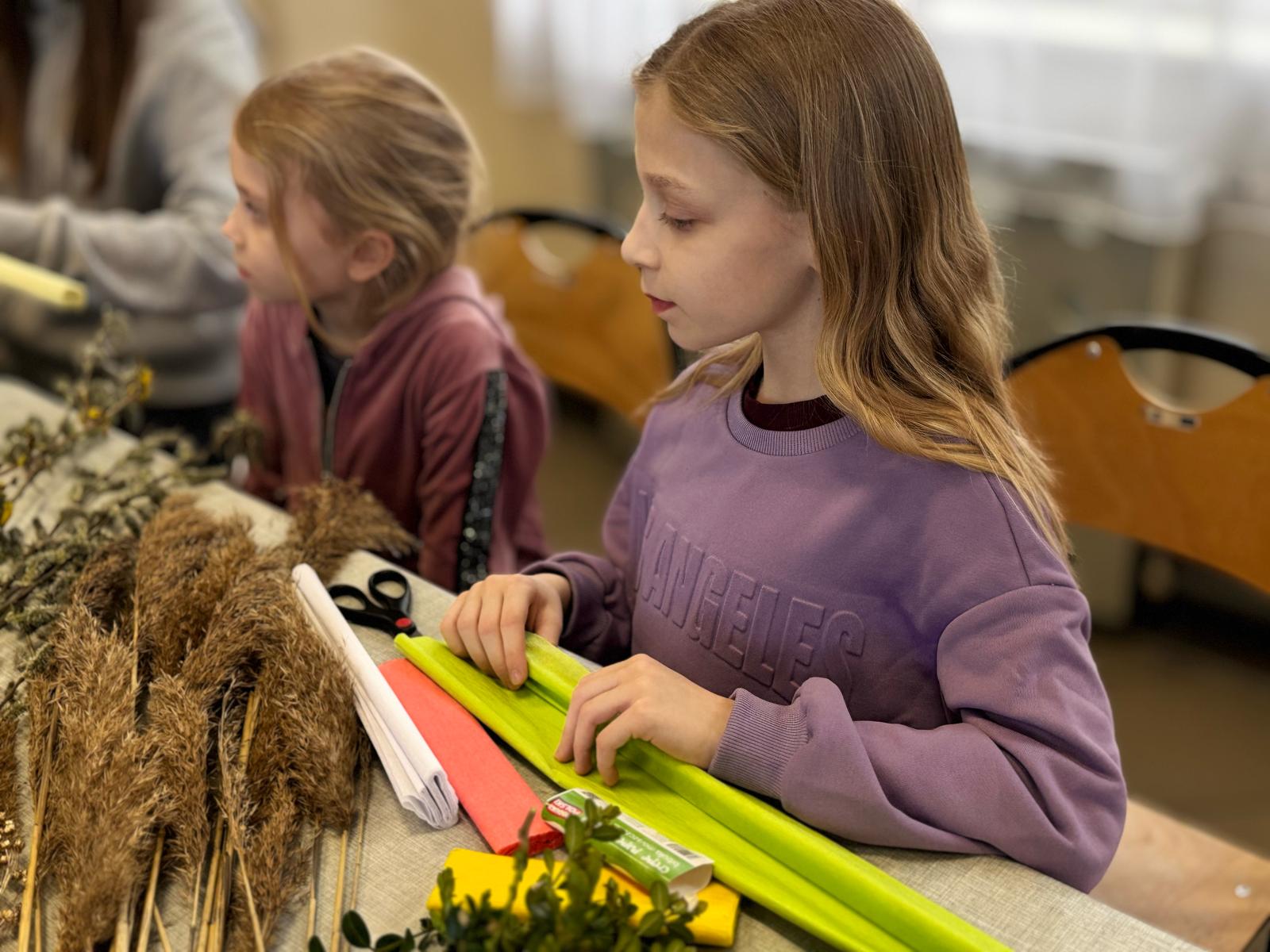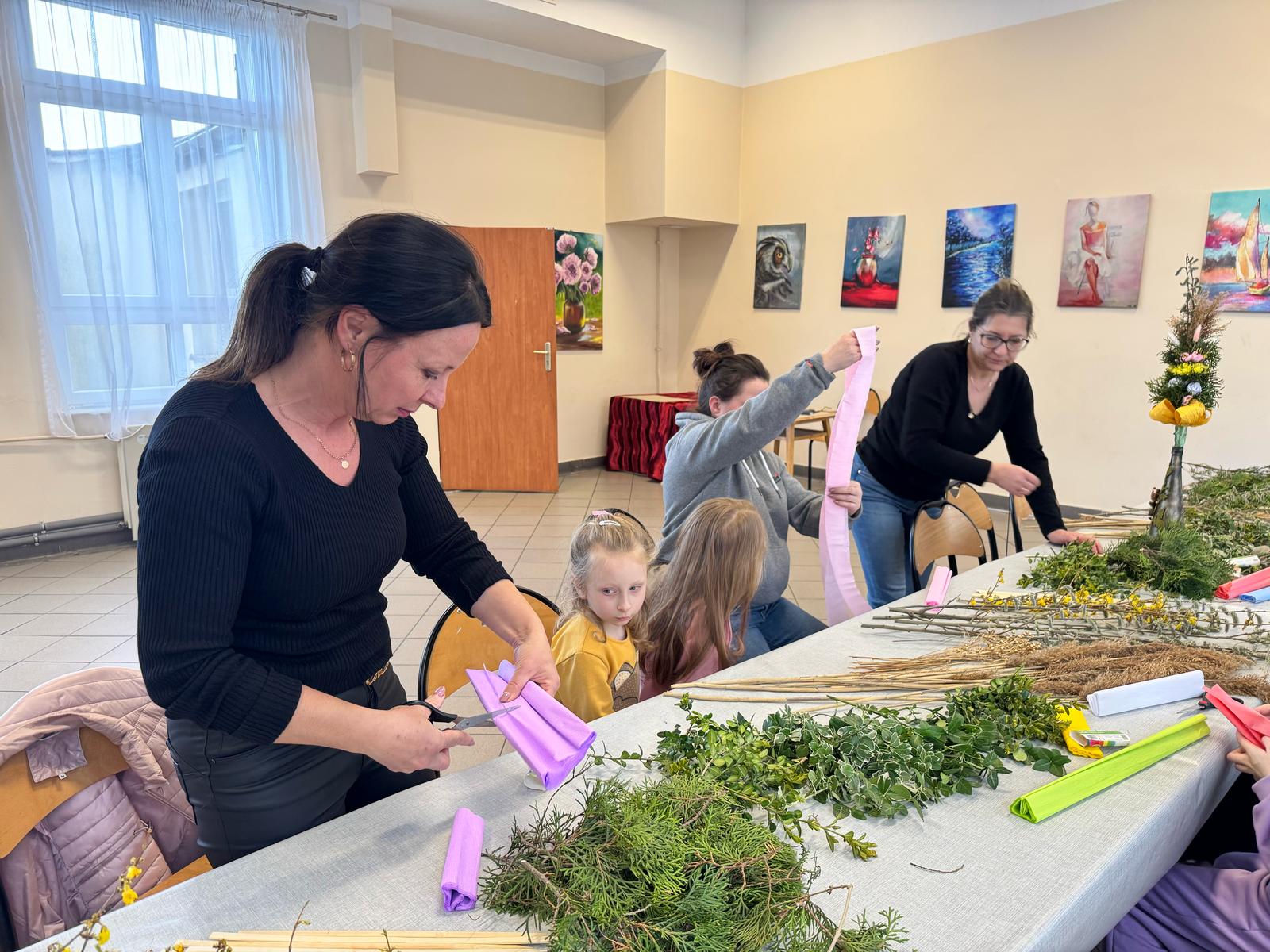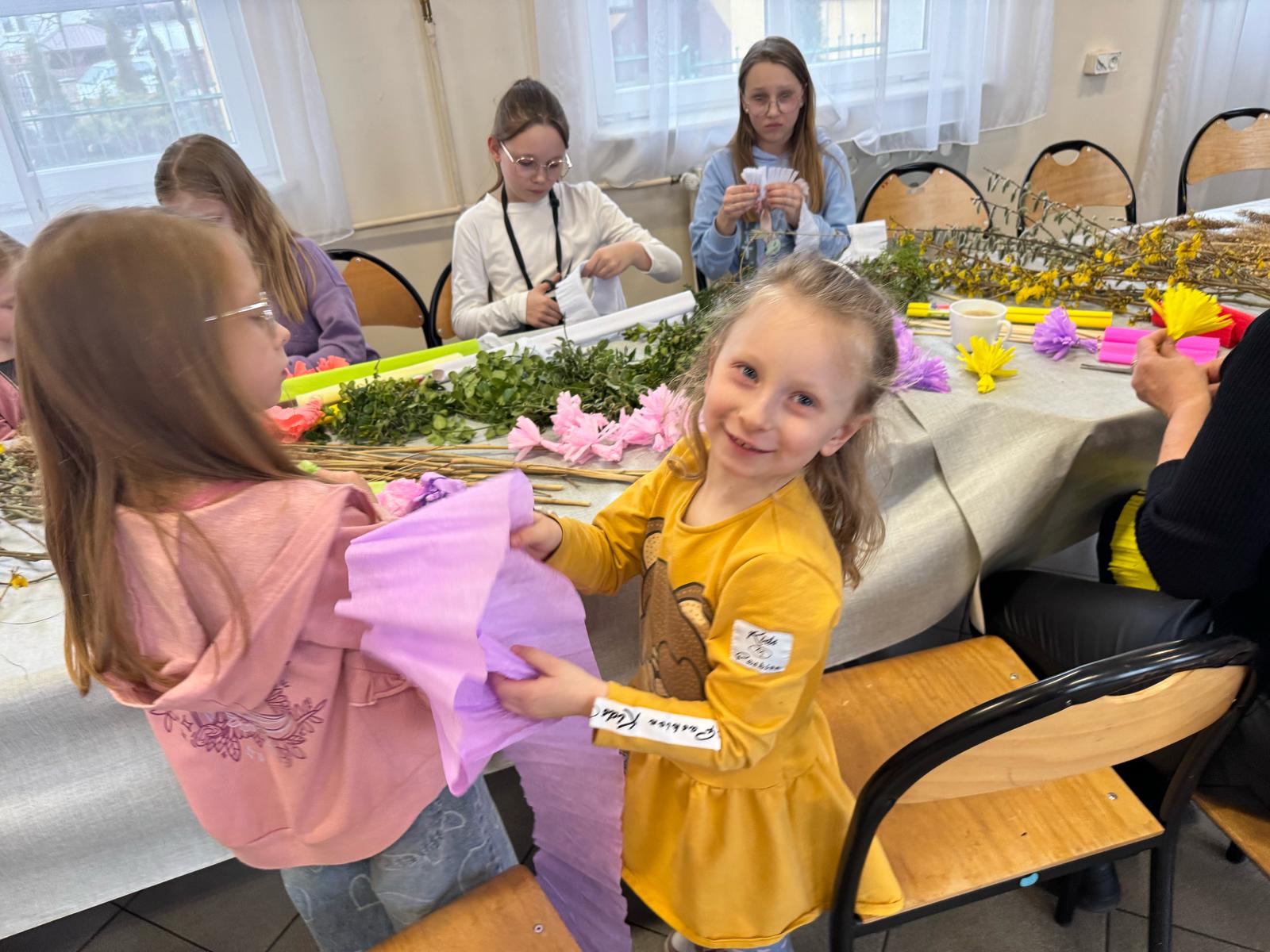 Pod czujnym okiem pani Beaty, która z pasją wprowadzała nas w tajniki tej pięknej tradycji, stworzyliśmy palmy zgodne z wielkanocnym zwyczajem. Wykorzystaliśmy naturalne materiały: bukszpan, suche trawy, puszystą trzcinę, bazie, gałązki tui, a także kolorowe wstążki i własnoręcznie wykonane kwiaty z krepiny i bibuły.