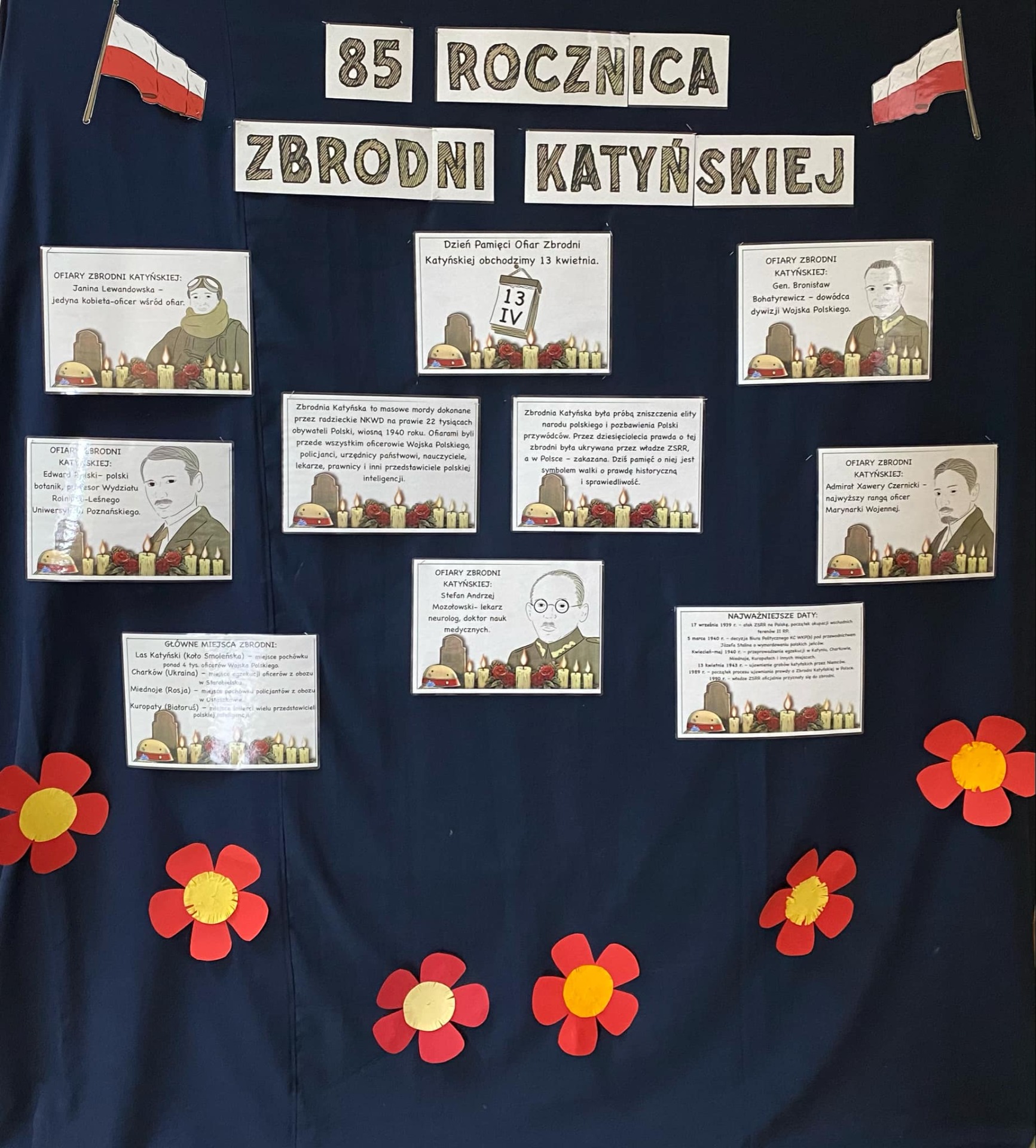 Społeczność naszej szkoły aktywnie włączyła się w obchody upamiętniające to dramatyczne wydarzenie z czasów II wojny światowej. Przygotowano okolicznościową wystawę, przedstawiającą podstawowe fakty i tło historyczne Zbrodni Katyńskiej. Uczniowie odwiedzili także symboliczny grób Edmunda Walczewskiego – jednej z ofiar katyńskiej egzekucji – znajdujący się na lokalnym cmentarzu. Ponadto delegacja szkoły wzięła udział w gminnych uroczystościach rocznicowych, składając hołd wszystkim pomordowanym.