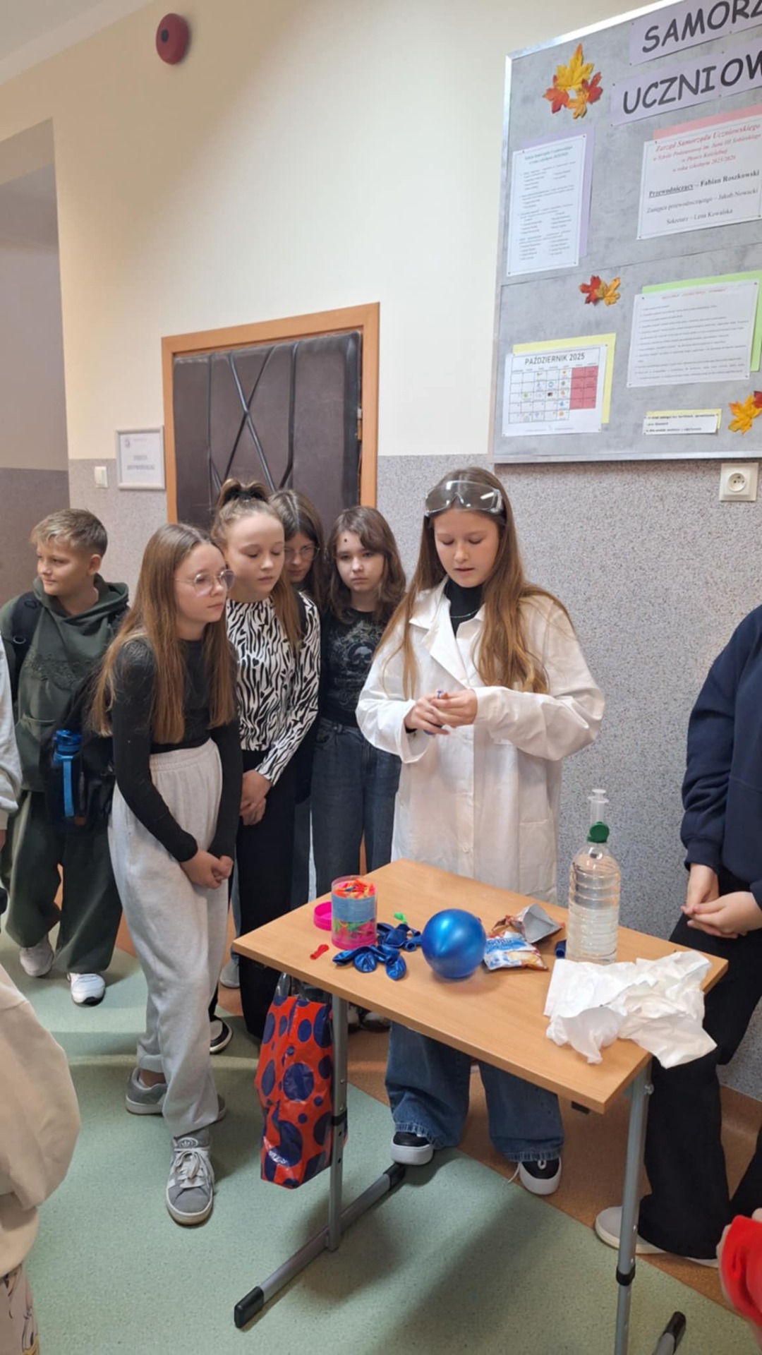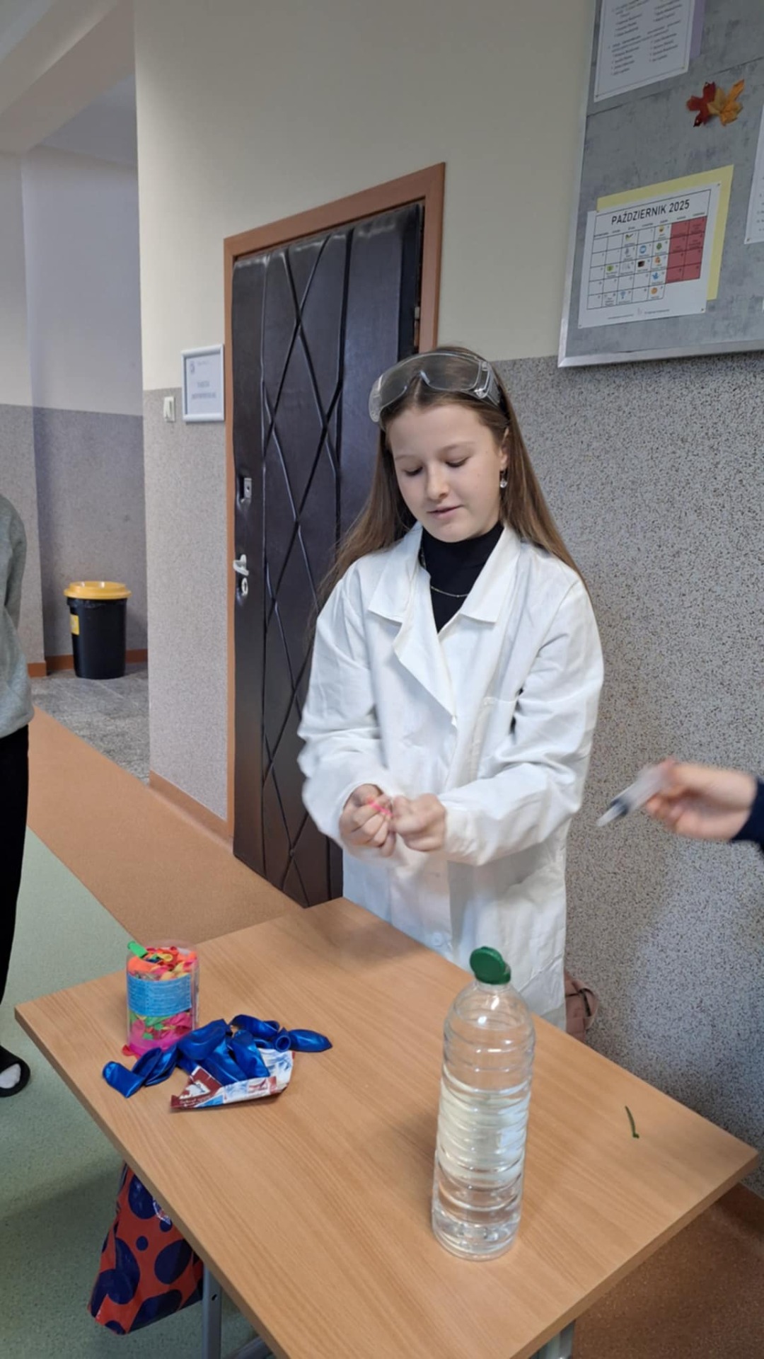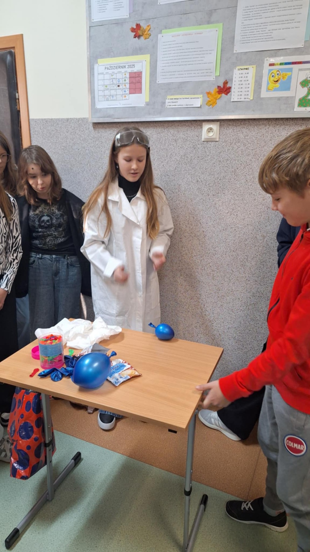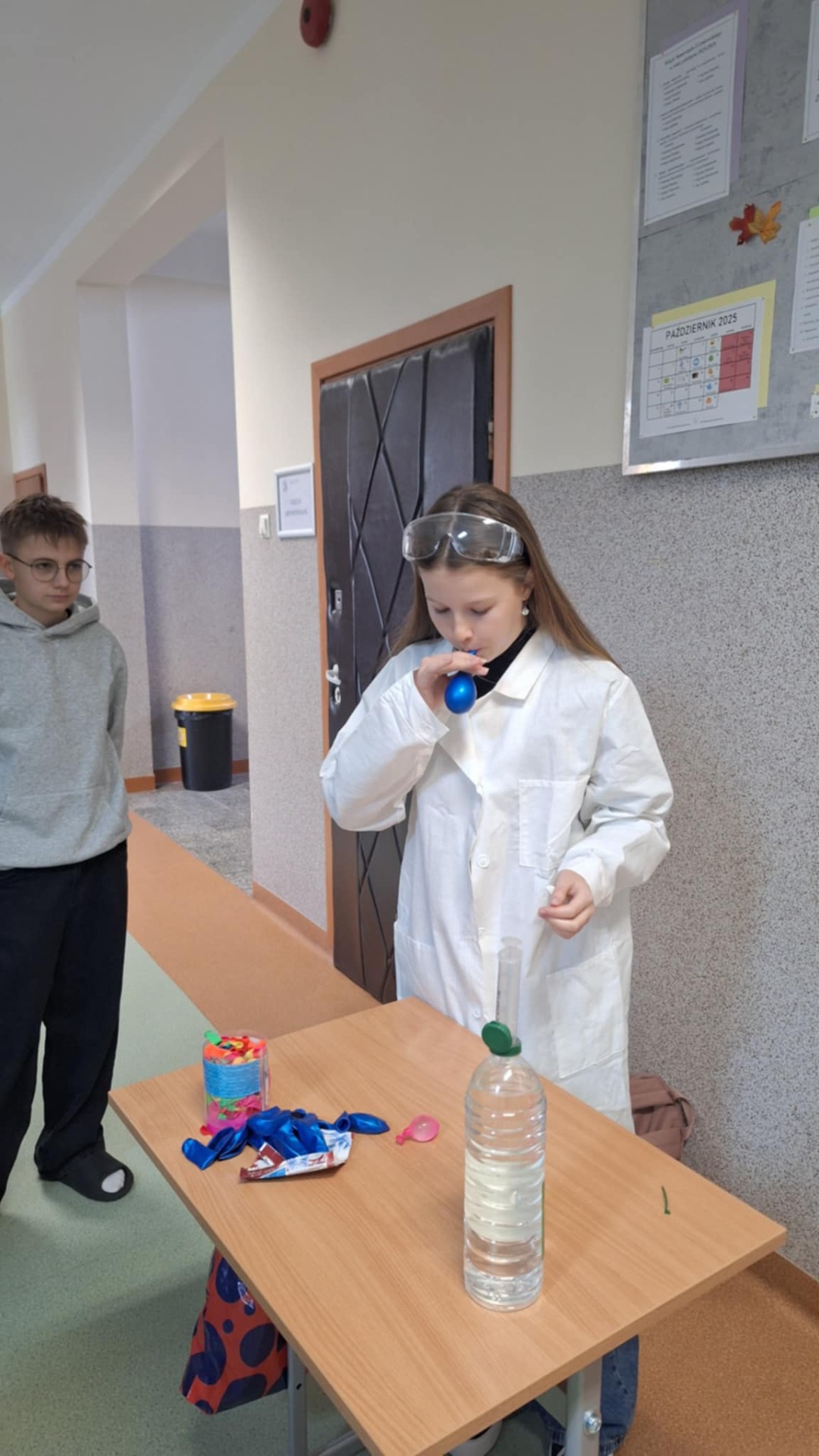 Podczas przerwy śródlekcyjnej Gabrysia z klasy 8 postanowiła podzielić się swoją pasją do nauki i zaprezentowała ciekawy eksperyment fizyczno-chemiczny. W prosty, ale efektowny sposób pokazała, jak wiedza z lekcji może ożyć w praktyce. Do doświadczenia wykorzystała dwa balony, umieszczone jeden w drugim. W jednym znajdował się ocet (kwas octowy), a w drugim soda oczyszczona (wodorowęglan sodu). Gdy jeden z balonów pękł, doszło do reakcji chemicznej pomiędzy tymi substancjami. W jej wyniku powstał gaz – dwutlenek węgla (CO₂). Co się stało dalej? Gaz zaczął wypełniać balon, powodując jego rozszerzenie. To świetny przykład, jak ciśnienie gazu może działać na elastyczne materiały i jak proste składniki z kuchni mogą posłużyć do pokazania praw chemii i fizyki. Eksperyment Gabrysi nie tylko wzbudził zainteresowanie kolegów i koleżanek, ale też pokazał, że nauka może być fascynująca i dostępna dla każdego. Brawo za pomysł i odwagę w dzieleniu się wiedzą!