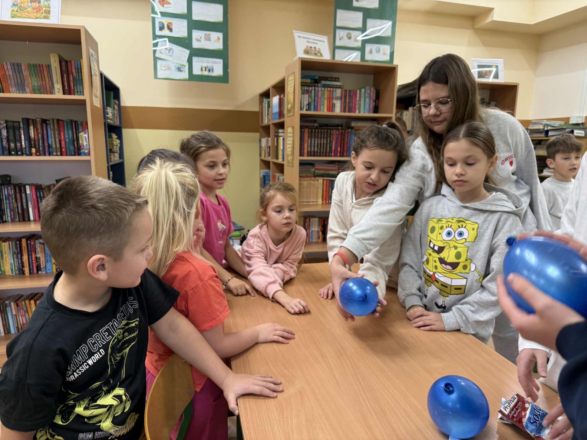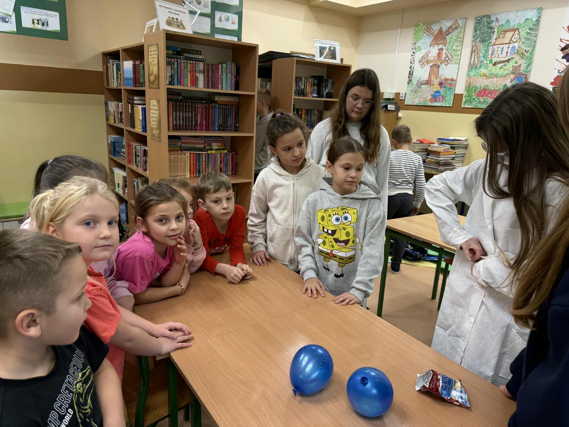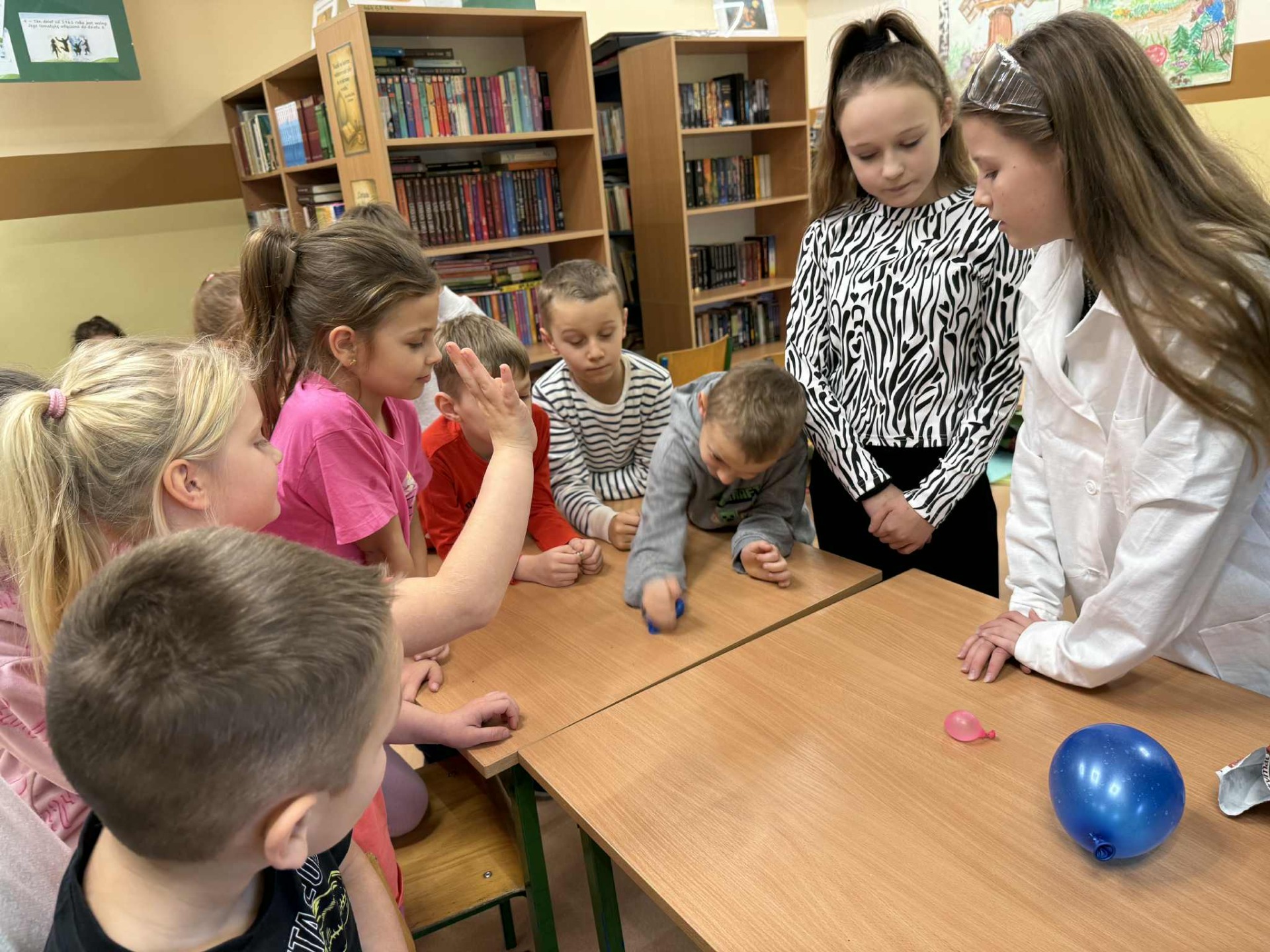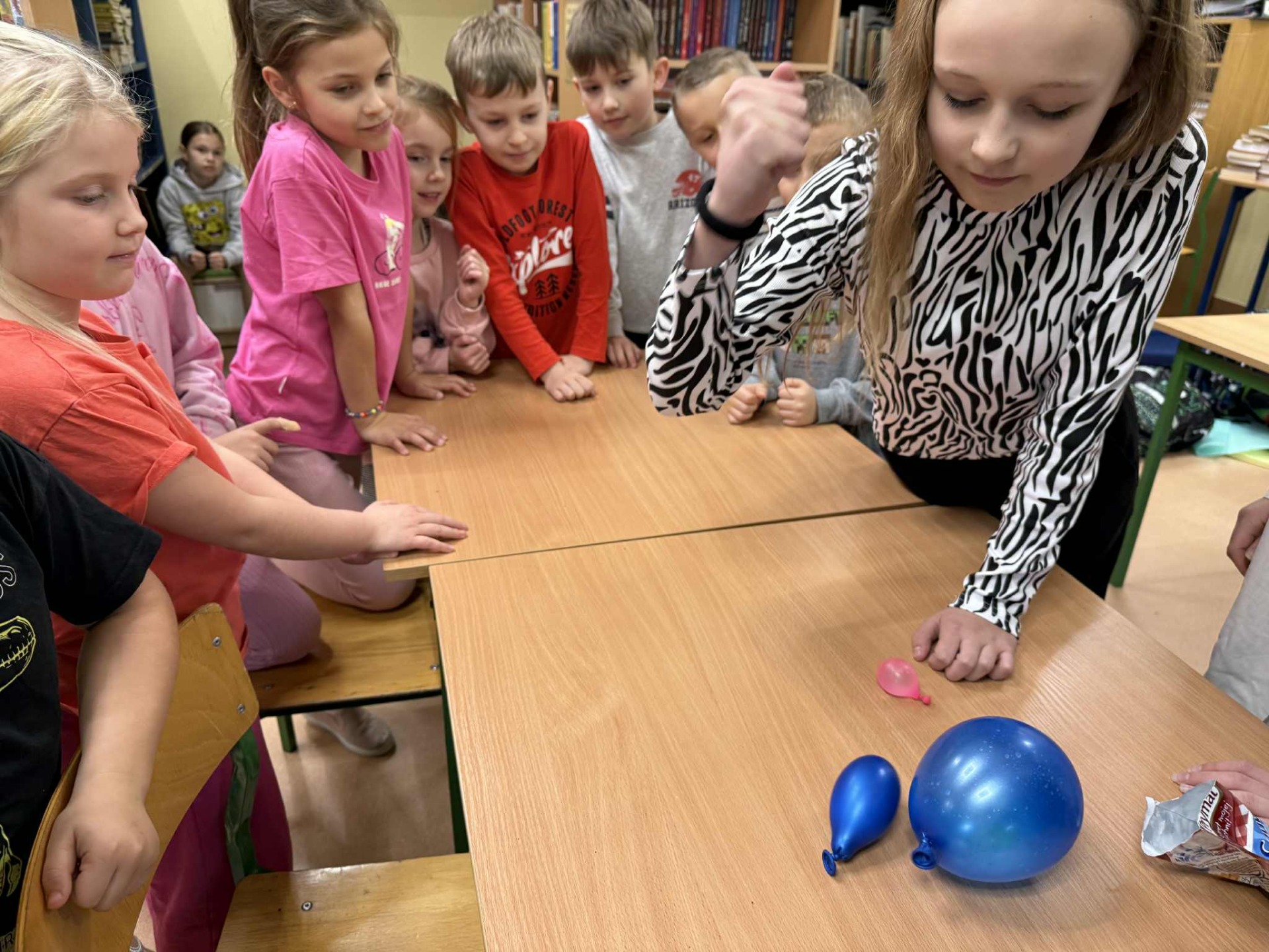 Podczas przerwy śródlekcyjnej Gabrysia z klasy 8 postanowiła podzielić się swoją pasją do nauki i zaprezentowała ciekawy eksperyment fizyczno-chemiczny. W prosty, ale efektowny sposób pokazała, jak wiedza z lekcji może ożyć w praktyce. Do doświadczenia wykorzystała dwa balony, umieszczone jeden w drugim. W jednym znajdował się ocet (kwas octowy), a w drugim soda oczyszczona (wodorowęglan sodu). Gdy jeden z balonów pękł, doszło do reakcji chemicznej pomiędzy tymi substancjami. W jej wyniku powstał gaz – dwutlenek węgla (CO₂). Co się stało dalej? Gaz zaczął wypełniać balon, powodując jego rozszerzenie. To świetny przykład, jak ciśnienie gazu może działać na elastyczne materiały i jak proste składniki z kuchni mogą posłużyć do pokazania praw chemii i fizyki. Eksperyment Gabrysi nie tylko wzbudził zainteresowanie kolegów i koleżanek, ale też pokazał, że nauka może być fascynująca i dostępna dla każdego. Brawo za pomysł i odwagę w dzieleniu się wiedzą!