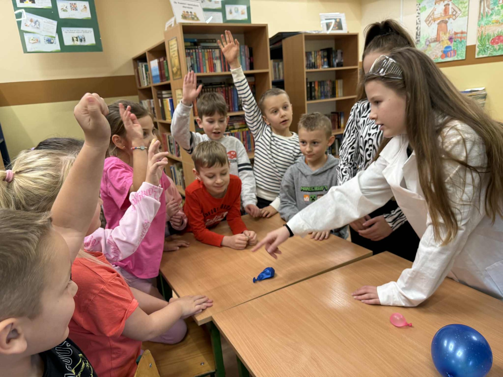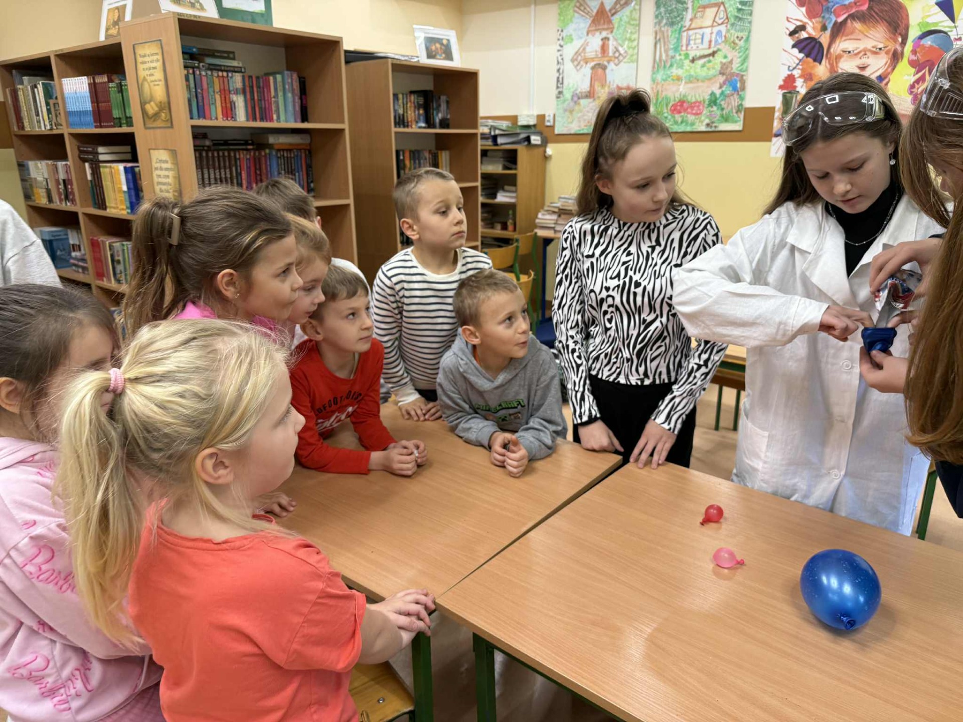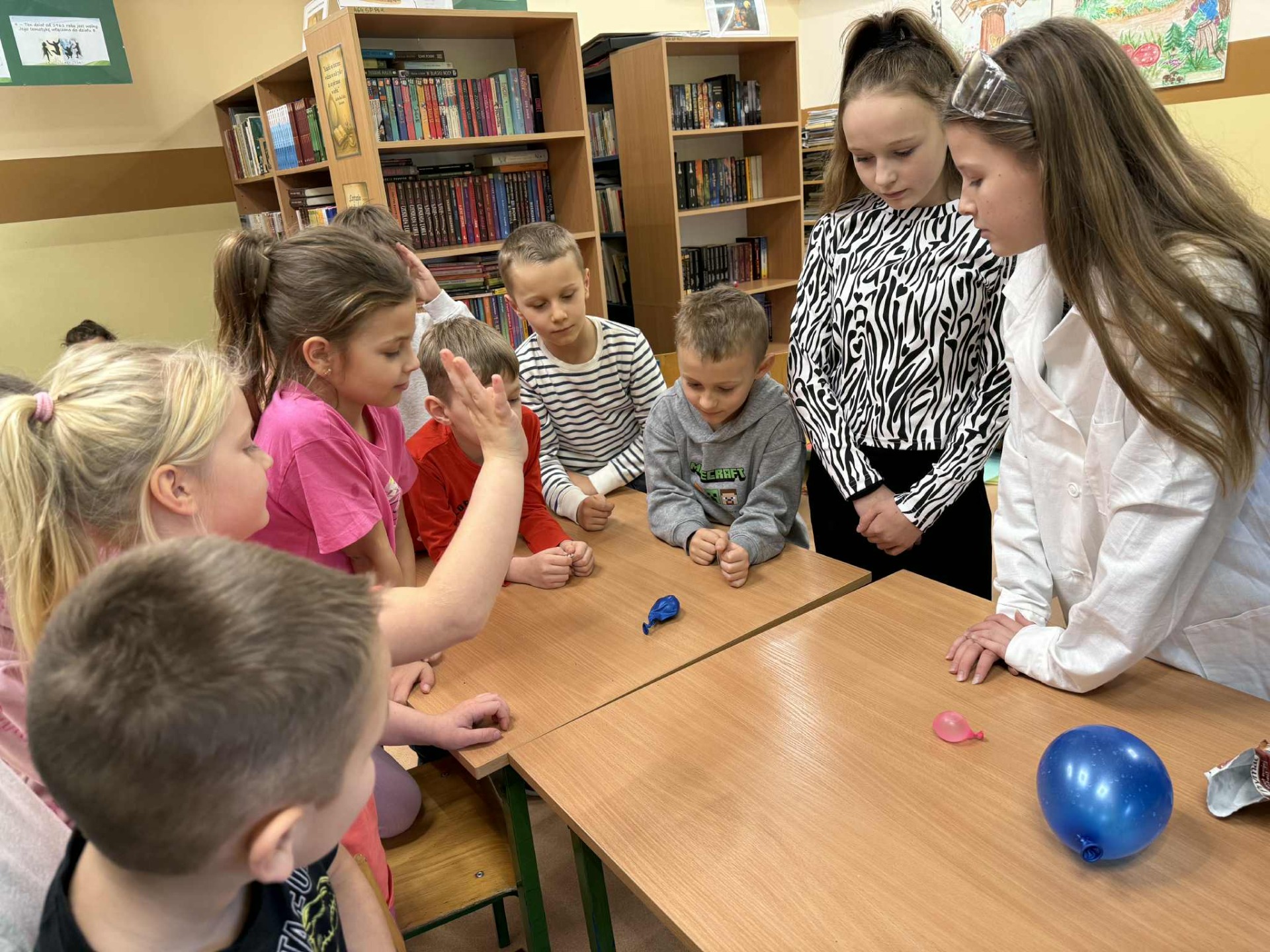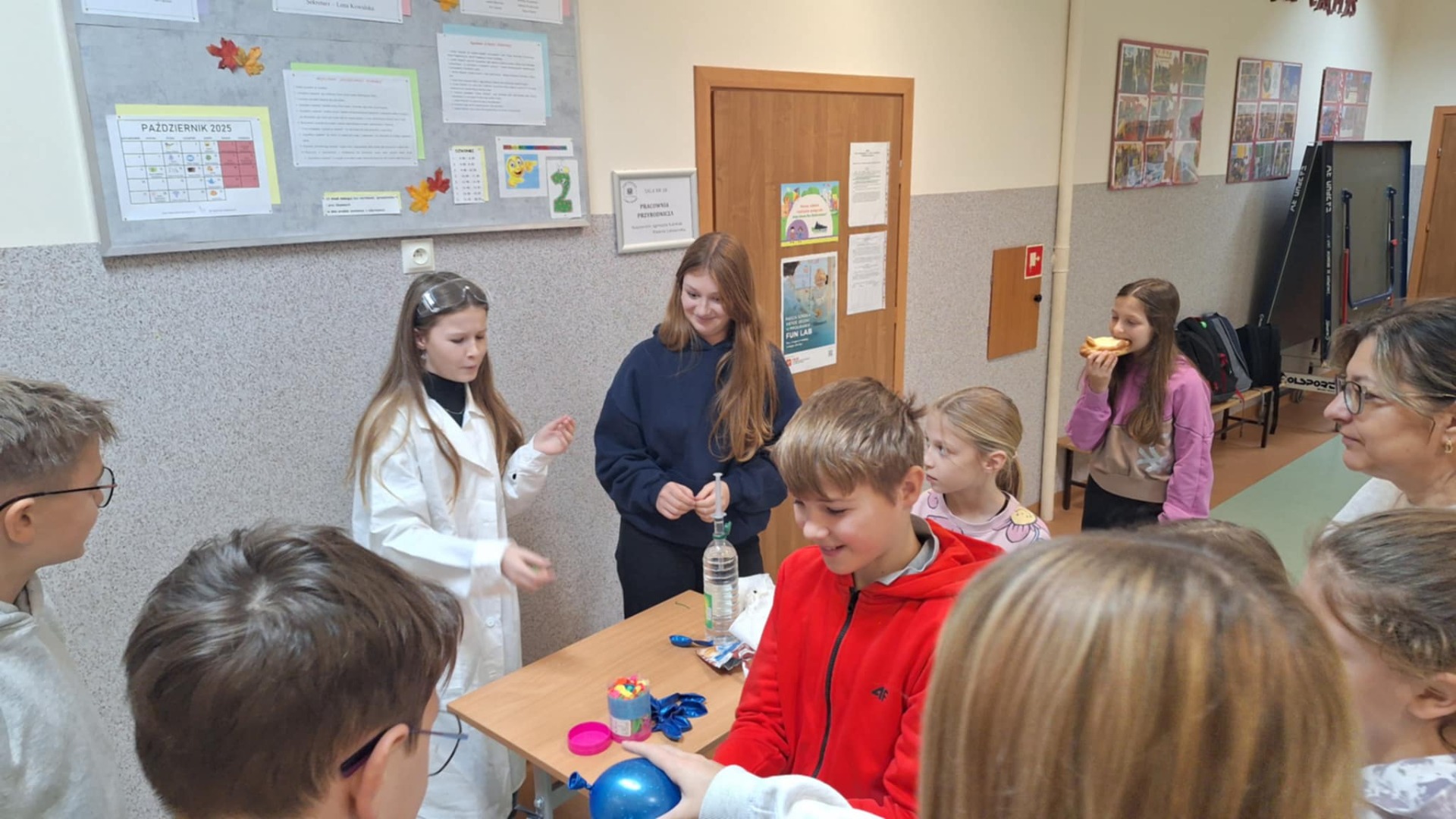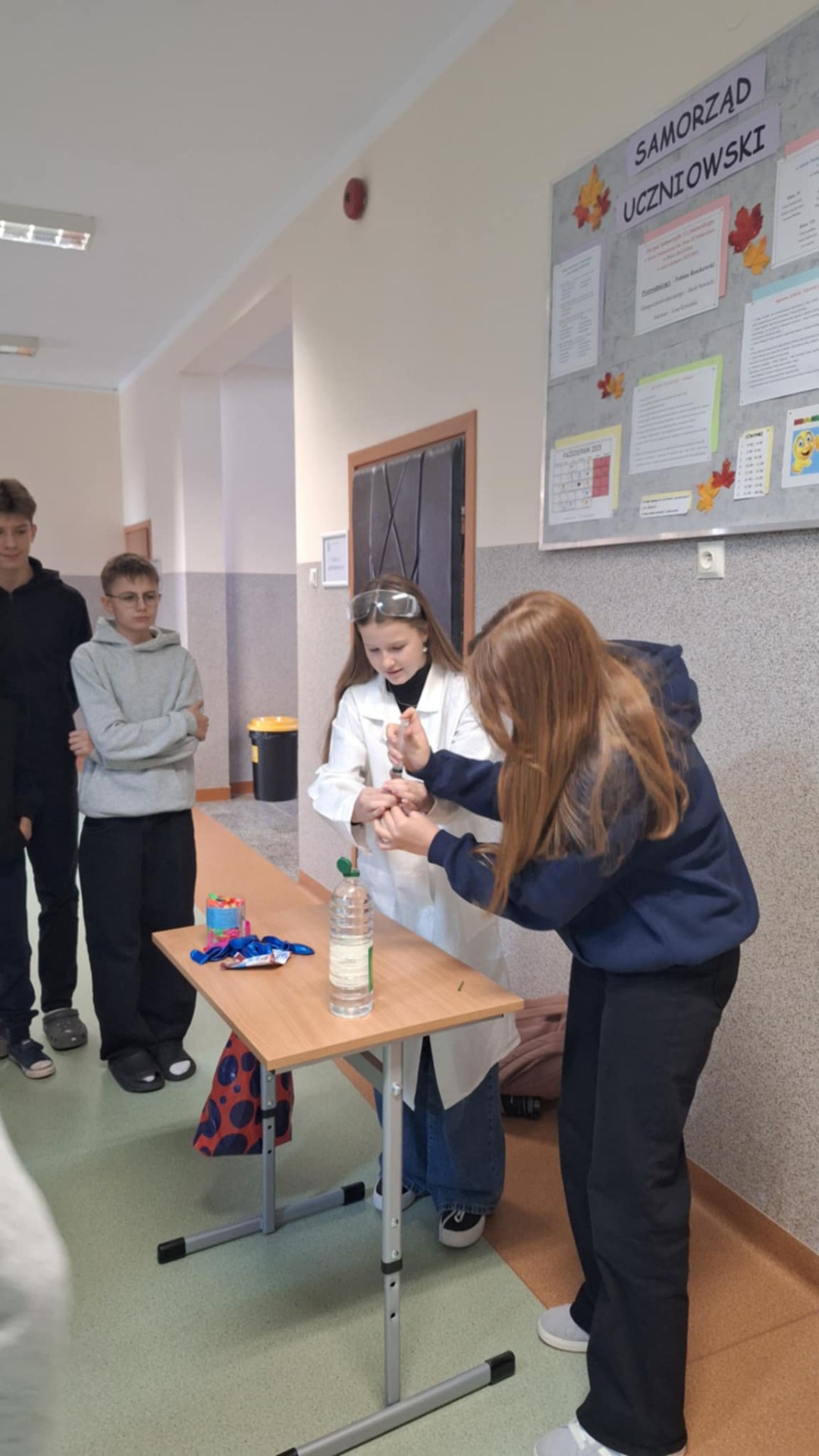 Podczas przerwy śródlekcyjnej Gabrysia z klasy 8 postanowiła podzielić się swoją pasją do nauki i zaprezentowała ciekawy eksperyment fizyczno-chemiczny. W prosty, ale efektowny sposób pokazała, jak wiedza z lekcji może ożyć w praktyce. Do doświadczenia wykorzystała dwa balony, umieszczone jeden w drugim. W jednym znajdował się ocet (kwas octowy), a w drugim soda oczyszczona (wodorowęglan sodu). Gdy jeden z balonów pękł, doszło do reakcji chemicznej pomiędzy tymi substancjami. W jej wyniku powstał gaz – dwutlenek węgla (CO₂). Co się stało dalej? Gaz zaczął wypełniać balon, powodując jego rozszerzenie. To świetny przykład, jak ciśnienie gazu może działać na elastyczne materiały i jak proste składniki z kuchni mogą posłużyć do pokazania praw chemii i fizyki. Eksperyment Gabrysi nie tylko wzbudził zainteresowanie kolegów i koleżanek, ale też pokazał, że nauka może być fascynująca i dostępna dla każdego. Brawo za pomysł i odwagę w dzieleniu się wiedzą!