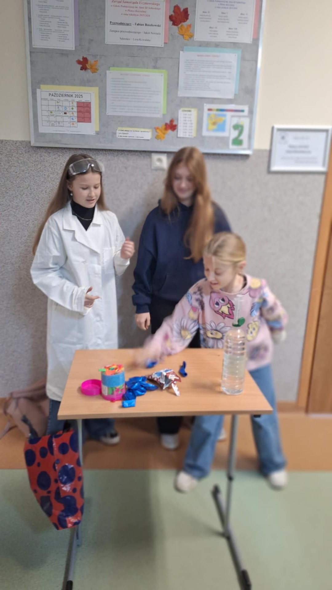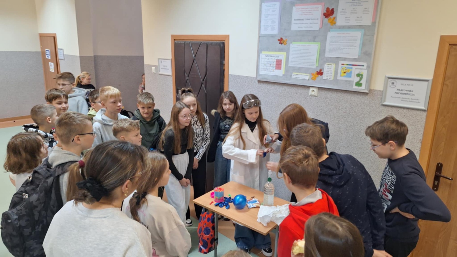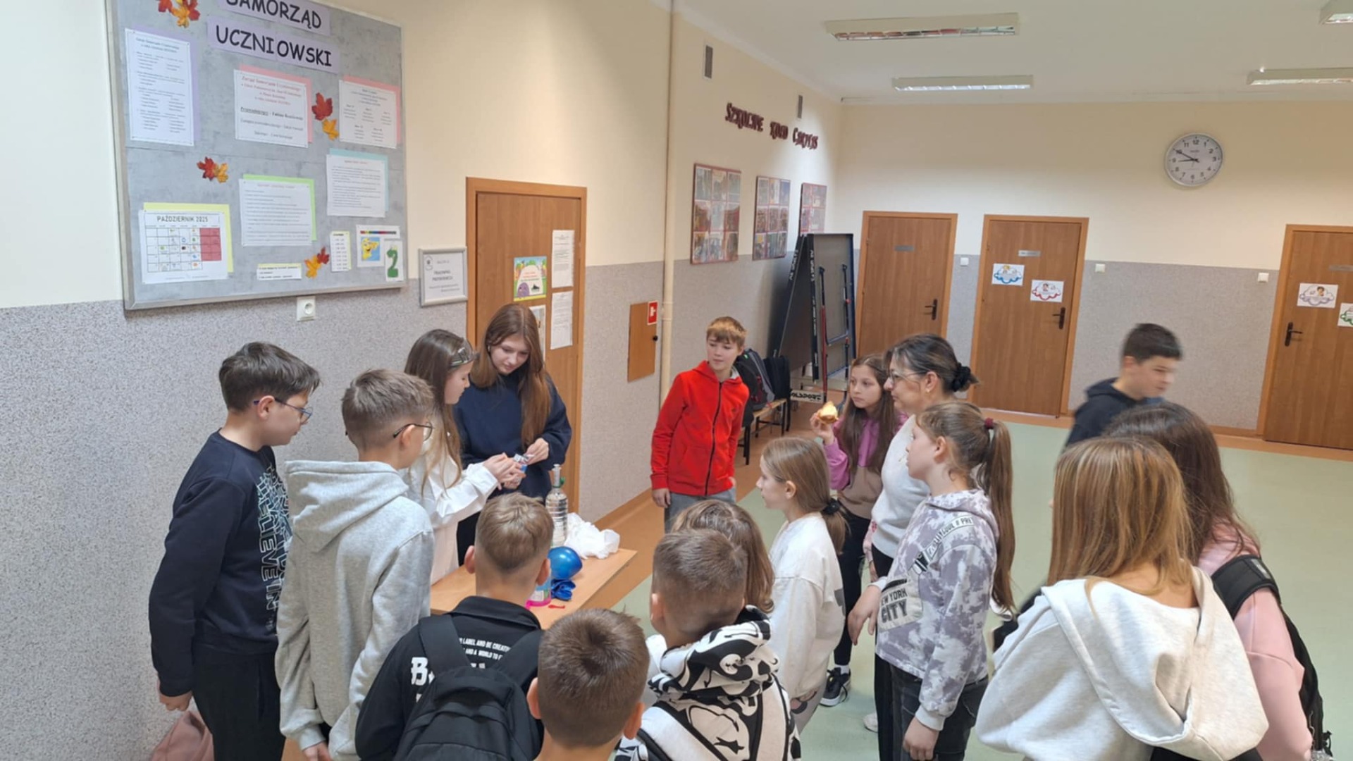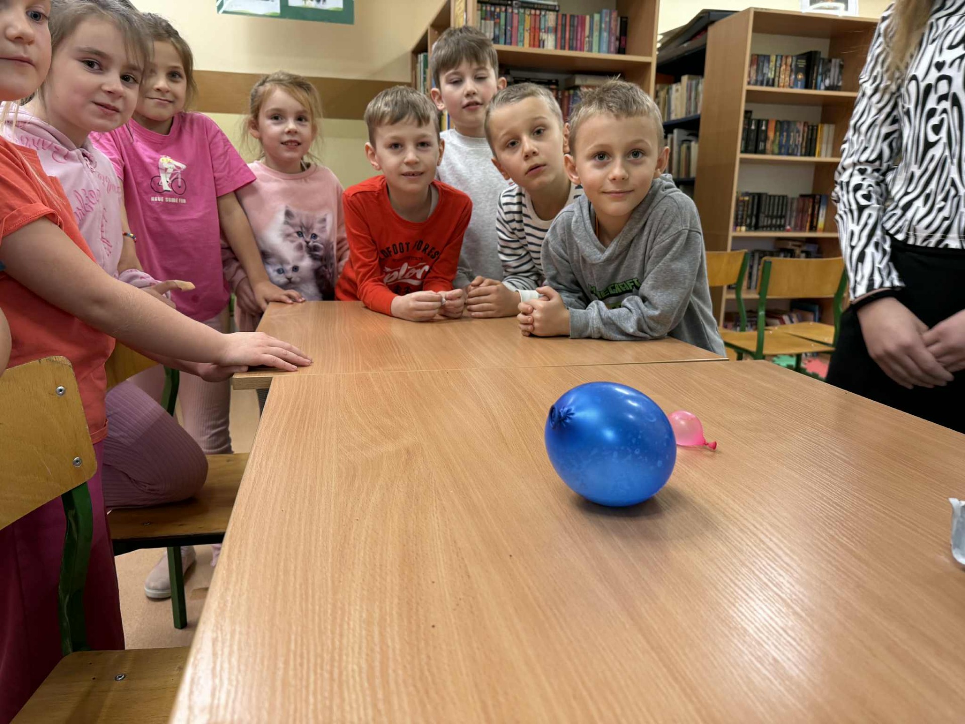 Podczas przerwy śródlekcyjnej Gabrysia z klasy 8 postanowiła podzielić się swoją pasją do nauki i zaprezentowała ciekawy eksperyment fizyczno-chemiczny. W prosty, ale efektowny sposób pokazała, jak wiedza z lekcji może ożyć w praktyce. Do doświadczenia wykorzystała dwa balony, umieszczone jeden w drugim. W jednym znajdował się ocet (kwas octowy), a w drugim soda oczyszczona (wodorowęglan sodu). Gdy jeden z balonów pękł, doszło do reakcji chemicznej pomiędzy tymi substancjami. W jej wyniku powstał gaz – dwutlenek węgla (CO₂). Co się stało dalej? Gaz zaczął wypełniać balon, powodując jego rozszerzenie. To świetny przykład, jak ciśnienie gazu może działać na elastyczne materiały i jak proste składniki z kuchni mogą posłużyć do pokazania praw chemii i fizyki. Eksperyment Gabrysi nie tylko wzbudził zainteresowanie kolegów i koleżanek, ale też pokazał, że nauka może być fascynująca i dostępna dla każdego. Brawo za pomysł i odwagę w dzieleniu się wiedzą!